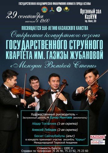 Концерт–открытие «Музыка Великой степи» посвящен 550-летию казахского ханства и представит публике произведения казахских авторов, как специально написанных для квартета, так и обработки известных произведений.