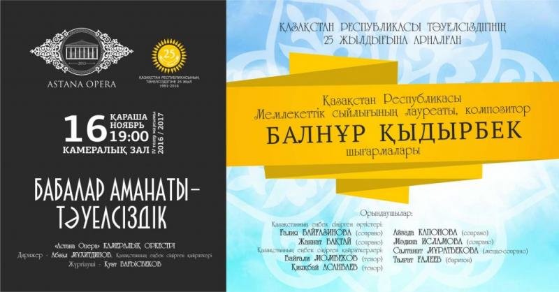 16 ноября в Камерном зале «Астана Опера» состоится концерт «Бабалар аманаты – Тәуелсіздік», где прозвучат произведения лауреата Государственной премии РК Балнур Кыдырбек. Председатель Союза композиторов РК, автор более 500 музыкальных произведений, стиль которых отличает неповторимый, колоритный и вместе с тем демократичный язык – композитор Балнур Кыдырбек в 2014 году за сочинение «Реквием» удостоилась