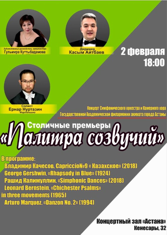 Все это стилевое разнообразие исполнят лауреаты международных и республиканских конкурсов – Камерный хор (под руководством отличника образования, деятеля культуры, профессора Гульмиры Куттыбадамовой), симфонический оркестр под руководством дирижера Касыма Айтбаева и солиста Ернара Нуртазина (фортепиано).