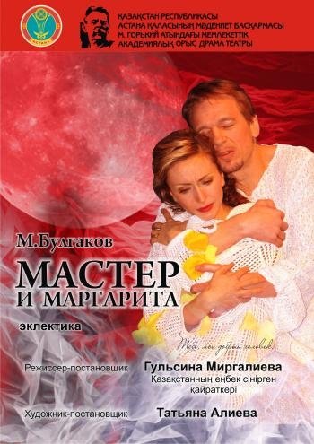 Постановка режиссера, заслуженного деятеля Республики Казахстан, лауреата премии "Тарлан" Г.Миргалиевой по бессмертному произведению М.Булгакова позволило театральной группе реализовать новый для театра жанр спектакля - эклектика. Здесь сошлись воедино фрагменты из инсценировки М.Рощина с текстами из романа, исторические мотивы и современные тенденции, монологи и диалоги булгаковских героев с оригинальным рисунком хореографа С.Жолумбаевой и стилиста Г.Зиятовой, а музыкальный ряд композитора Е.Терехиной с талантливым прочтением художника-постановщика Т.Алиевой представили на суд зрителей по истине уникальный спектакль.