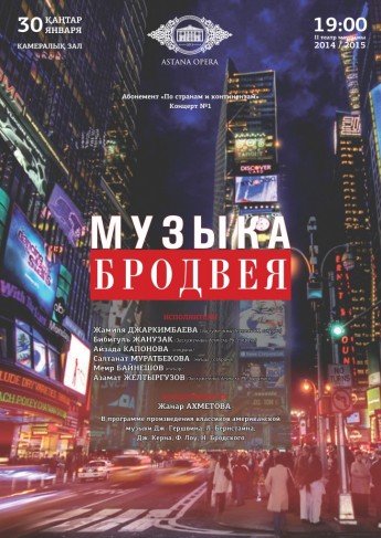 30 января в Камерном зале «Астана Опера» состоится концерт «МУЗЫКА БРОДВЕЯ» в рамках абонемента «По странам и континентам».