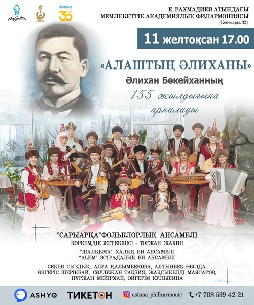 Қазақтың мемлекеттік, саяси және қоғам қайраткері, ұлт-азаттық және Алаш партиясының жетекшісі, Алашорда автономиялы үкіметінің төрағасы, публицист, ғалым, аудармашы Әлихан Бөкейханұлының 155 жылдығына арналған «Алаштың Әлиханы» атты концерт өтеді. Концертте «Сарыарқа» фольклорлық ансамблінің орындауында қазақ зиялылары мен алаш арыстарына арналған, ел тәуелсіздігі жолындағы күрескерлер жайлы шығармалар орындалады. Ансамбльмен бірге елімізге белгілі филармония әншілері, «Шалқыма» халық би ансамблі мен «Alem» эстрадалық би ансамблі өнер көрсетеді. Күйлермен қатар, алаш арыстарына арналған жаңа әндер де шырқалатын болады.