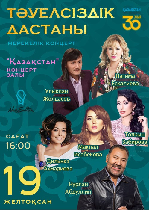 В концерте примут участие звезды казахстанской эстрады исполняя известные хиты за 30 летний период Независимости Республики Казахстан.