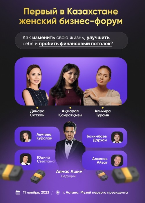 Женский бизнес форум, целью которого является дать возможность каждой женщине выйти на новый, более качественный уровень жизни, повысить свои финансовые возможности, а также научиться проявлять себя и быть креативной и эффективной. Спикеры форума - успешные женщины из мира бизнеса, спорта, кино, моды, искусства и медиа, которые служат источником вдохновения и мотивируют нас на развитие. Они расскажут, как женщине достичь гармонии с собой и с миром, как оставаться нежной и чувственной, не теряя при этом «баллы» профессионализма, и как применять настоящую женскую силу для достижения своих целей. В программе мероприятия: кофе-брейк, нетворкинг и обмен опытом с успешными женщинами, изучение инструментов брендинга и стратегий роста личного дохода, а также розыгрыш призов. Для участниц форума обязателен дресс-код — цвета колибри. В качестве спикеров будут выступать: Динара Сатжан, «Личный бренд, метод Динары Сатжан»; Акмарал Кайраткызы «Как стать блогером и зарабатывать на этом» Альмира Турсын, «Как зарабатывать по-женски», Куралай Авутова: «Как изменить свою жизнь и пробить финансовый потолок», Юдина Светлана, «Быть Мировой личностью – это норма, Бакимбаев Дархан, «Развитие бизнеса», Алкенов Айзат, «Масштабирование бизнеса», Альмира Турсын, «Как зарабатывать по-женски», Алмас Ашим, «Ораторское искусство».