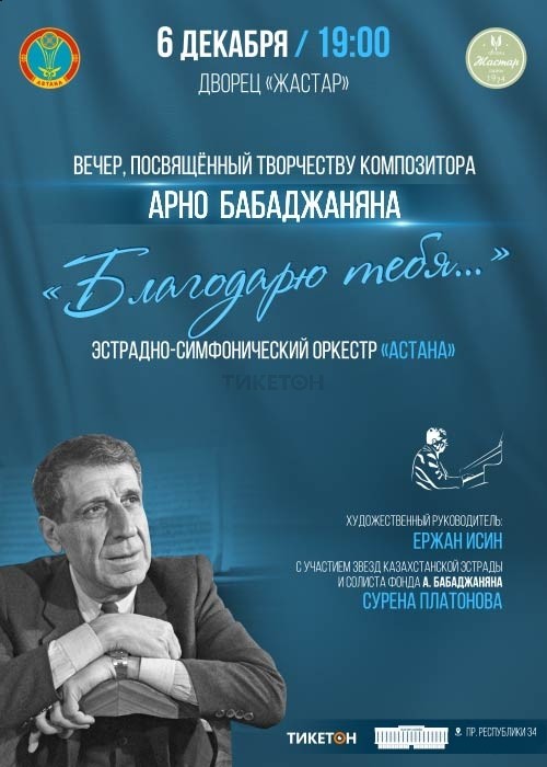 Эстрадно-симфонический оркестр «Астана» столичного акимата, под управлением художественного руководителя Ержана Исина, подарит зрителям Концертную программу «Благодарю тебя…». Оркестр исполнит незабываемые произведения, завораживая волшебной атмосферой музыки и творчества Арно Бабаджаняна. Его прекрасные песни о молодости, о любви, о надежде прозвучат в исполнении артистов казахстанской эстрады и солистов фонда А. Бабаджаняна.