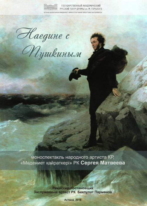 Моноспектакль Заслуженного деятеля РК, Народного артиста КР, «Мәдениет қайраткері» РК Сергея Матвеева «Наедине с Пушкиным» представляет собой удивительно тонкий и невероятно трепетный «диалог» великого гения со зрителем, в котором раскрываются с новой стороны «лирические волненья» «Скупого рыцаря», «Сцены из Фауста», «Пророка» и «Осени», а так же «сильные страсти и огненное воображение» Германа из «Пиковой дамы».