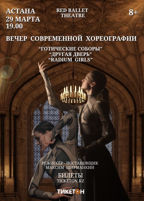 В рамках Танцевального проекта «FOCUS», пройдет Вечер Современной Хореографии Театра танца «RED BALLET», в котором будут представлены три одноактных спектакля: «Готические соборы», «Другая дверь», «Radium girl». Режиссер постановщик Максим Ширманкин.