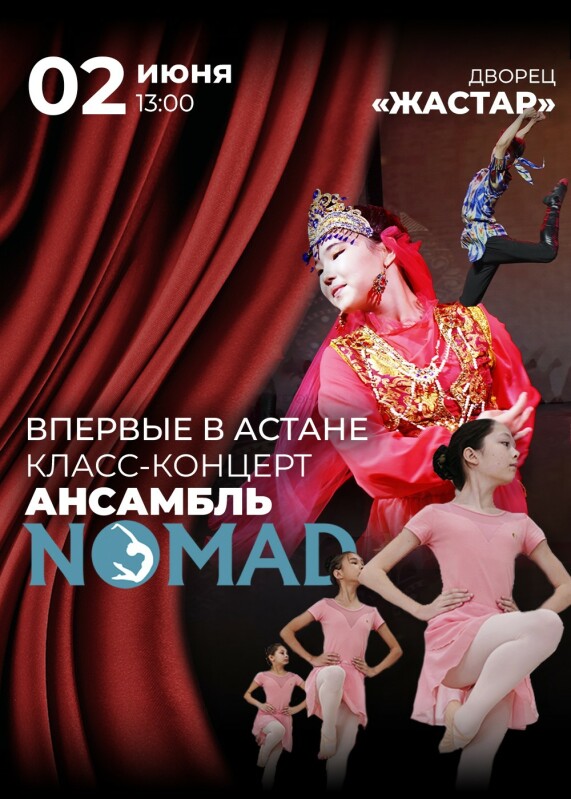 1 блок: Класс-концерт воспитанников Ансамбля АХ «NOMAD» с 3 лет до 17 лет. На класс-концерте демонстрируется ход занятий, упражнения, гимнастика, а также ритмика, и спортивно-трюковая ритмика для мальчиков, которые преподаются группам Ансамбля по авторской запатентованной методике руководителя Айнагуль Нургазиной.
