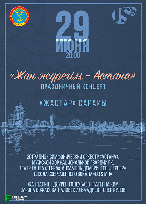 В честь дня рождения любимой столицы Дворец «Жастар» подготовил праздничный фееричный концерт «Жан жүрегім Астана». В программе столичный Эстрадно-симфонический оркестр «Астана», Ансамбль домбристов «Серпер», Мужской хор Национальной Гвардии РК. Своими голосами зрителя порадуют талантливые юные исполнители Школы современного вокала «До Star», а хореографическую часть концертной программы представит коллектив Театра Танца «ТЕРРА».