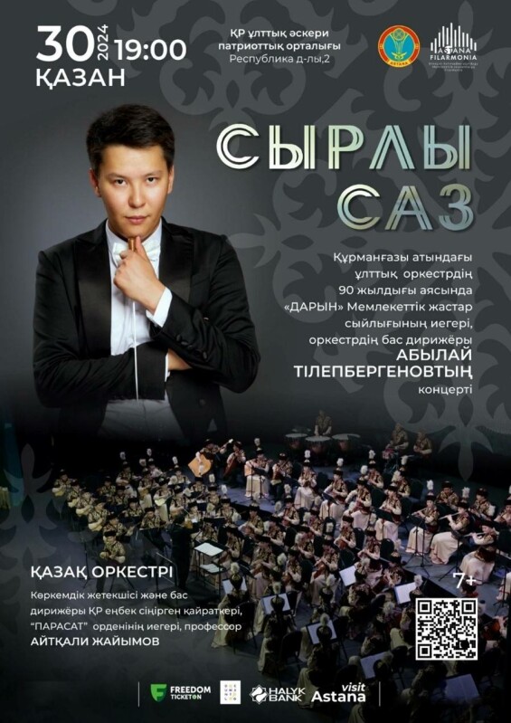 Құрманғазы атындағы ұлттық оркестрдің 90 жылдығы аясында «ДАРЫН» Мемлекеттік жастар сыйлығының иегері, оркестрдің бас дирижёры АБЫЛАЙ ТІЛЕПБЕРГЕНОВТЫҢ «Сырлы саз» атты концертін тамашалайсыздар.