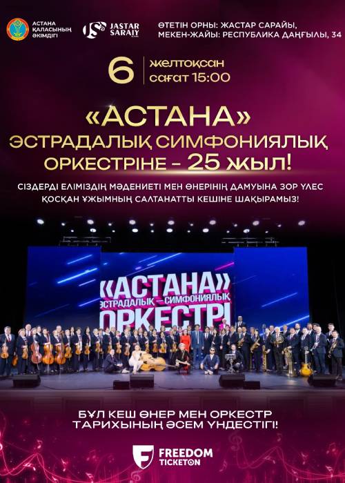 6 декабря 2025 года в 15.00 во «Дворце Жастар» состоится Юбилейный концерт Эстрадно-симфонического оркестра «Астана» в честь 25-летия со дня основания творческого коллектива.