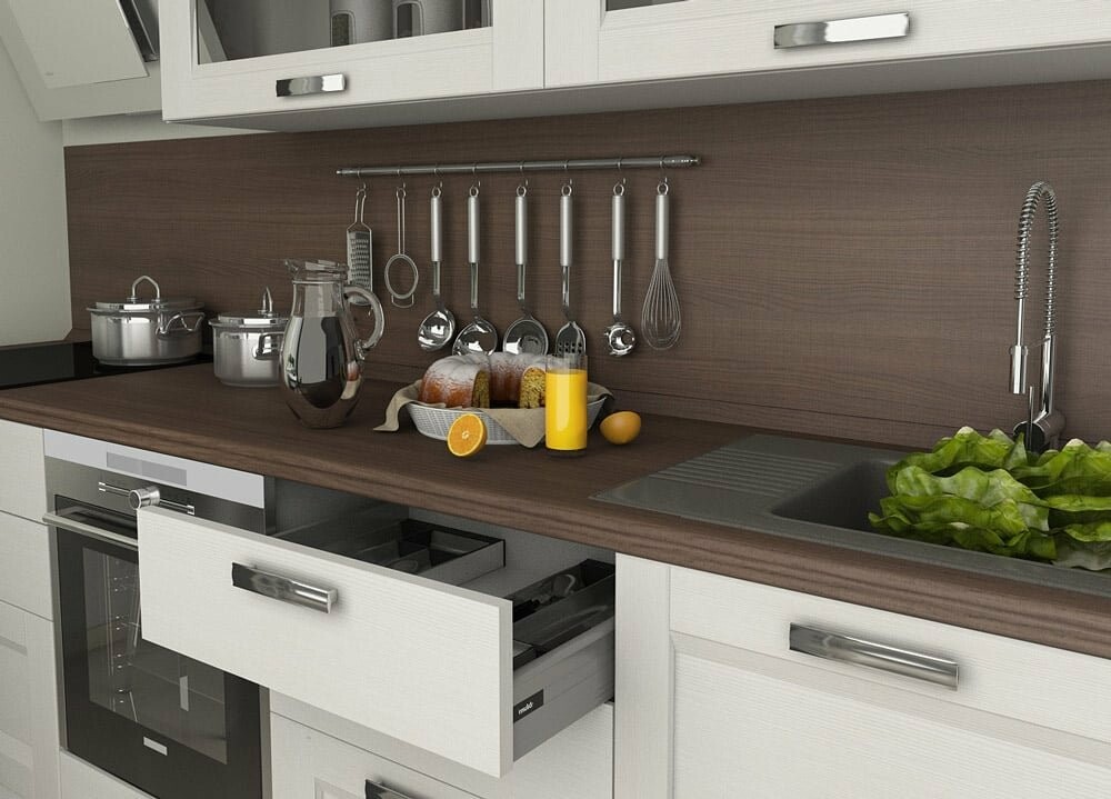 Практичным дополнением являются планки под столешницу. Они обеспечивают дополнительную жесткость конструкции и делают ее эксплуатацию более комфортной. Актуальны такие решения для больших кухонь, где поверхность испытывает повышенные нагрузки.