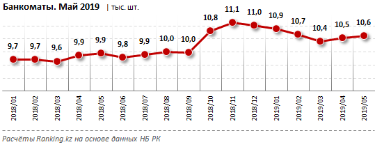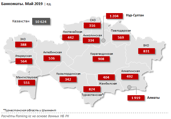 «Среди регионов РК больше всего банкоматов сосредоточено в Алматы (1,9 тыс. устройств), и Нур-Султане (1,2 тыс.), что составляет 18,1% и 11,3% от РК соответственно. Третье место занимает Карагандинская область: 908 банкоматов, или 8,5% от РК. Наибольший годовой рост в процентном соотношении зафиксирован в Алматинской области: на 18,6%, до 492 устройств; в абсолютном значении – в Нур-Султане (на 105 банкоматов) и Карагандинской области (на 101 устройство)», – сообщает издание.