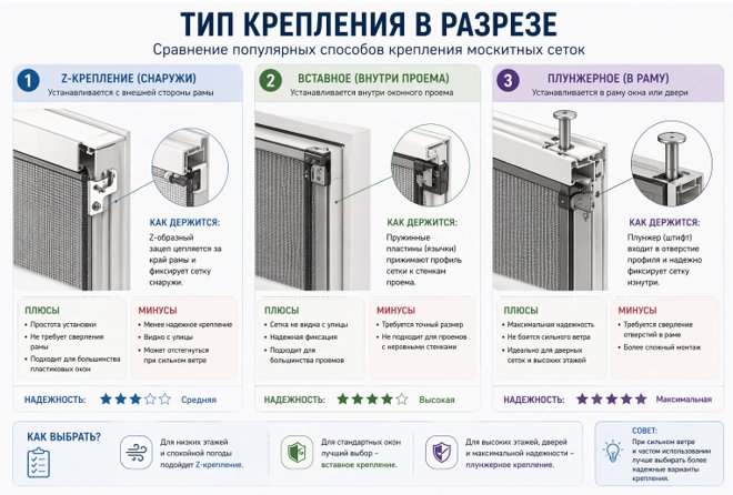 Идеальный вариант — металлические Z-крепления или плунжеры (пружинные штифты). Плунжерная система считается самой надежной, так как сетка монтируется непосредственно в проем и её невозможно выдавить снаружи. Профиль же лучше выбирать алюминиевый с порошковой покраской — он не желтеет и не трескается от мороза в -35°C.