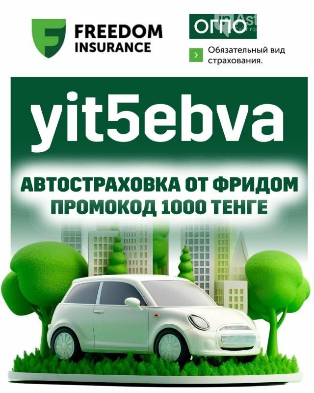 Оформите полис обязательного страхования (автостраховка) ОГПО ВТС в приложении Freedom SuperApp (Фридом СуперАпп) с выгодой: получите бонус 1000 тенге и кешбэк до 27% по промокоду 575851 или yit5ebva